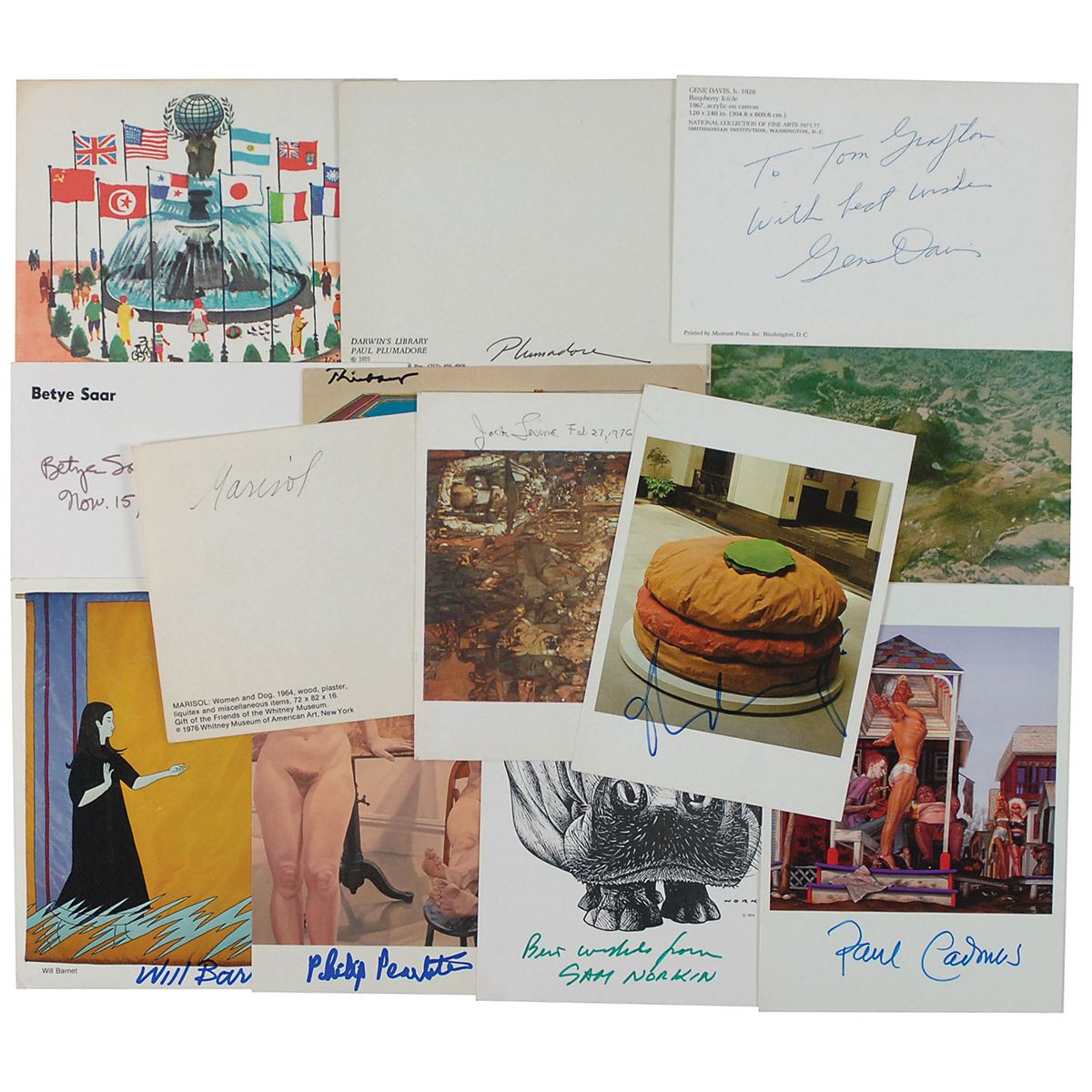 Thirteen postcards of various sizes depicting different works of art, 11 color, each signed in felt tip or ballpoint by the associated artist. Signers are: Paul Cadmus, Wayne Thiebaud, Will Barnet, Jack Levine, Philip Pearlstein, Dennis Oppenheim, Claes Oldenburg, Marisol, Betye Saar, Dong Kingman, Paul Plumadore, Gene Davis, and Sam Norkin. In overall fine condition.