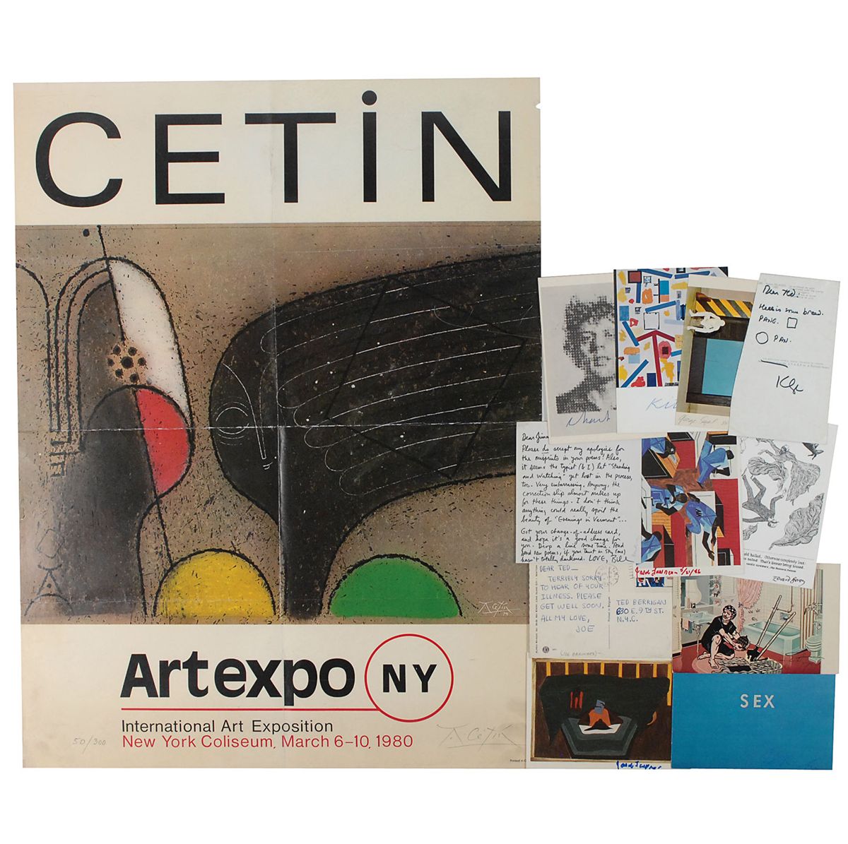 Collection of 12 items consisting of various size signed postcards, a note, and a poster, each signed in ink or felt tip by a different artist. Signers are: Chuck Close, Erro, George Segal, Jacob Lawrence (2), Ed Ruscha, Edward Gorey, Bill Berkson, Joe Brainard, Ronald Kitaj, Cetin, and one other. In overall very good condition.
