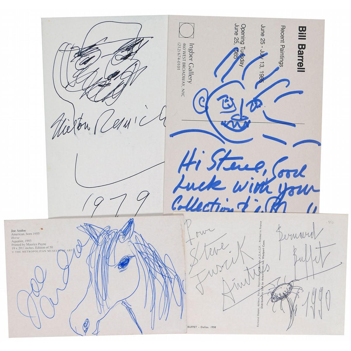 Four original signed felt tip or ballpoint sketches on the reverse of color postcards ranging in size from 6 x 4 to 5.25 x 7. Sketches are by Joe Andoe, Bill Barrell (ins), Bernard Buffet (ins), and Milton Resnick. A crease and slight brushing to the Resnick sketch, otherwise overall fine condition.