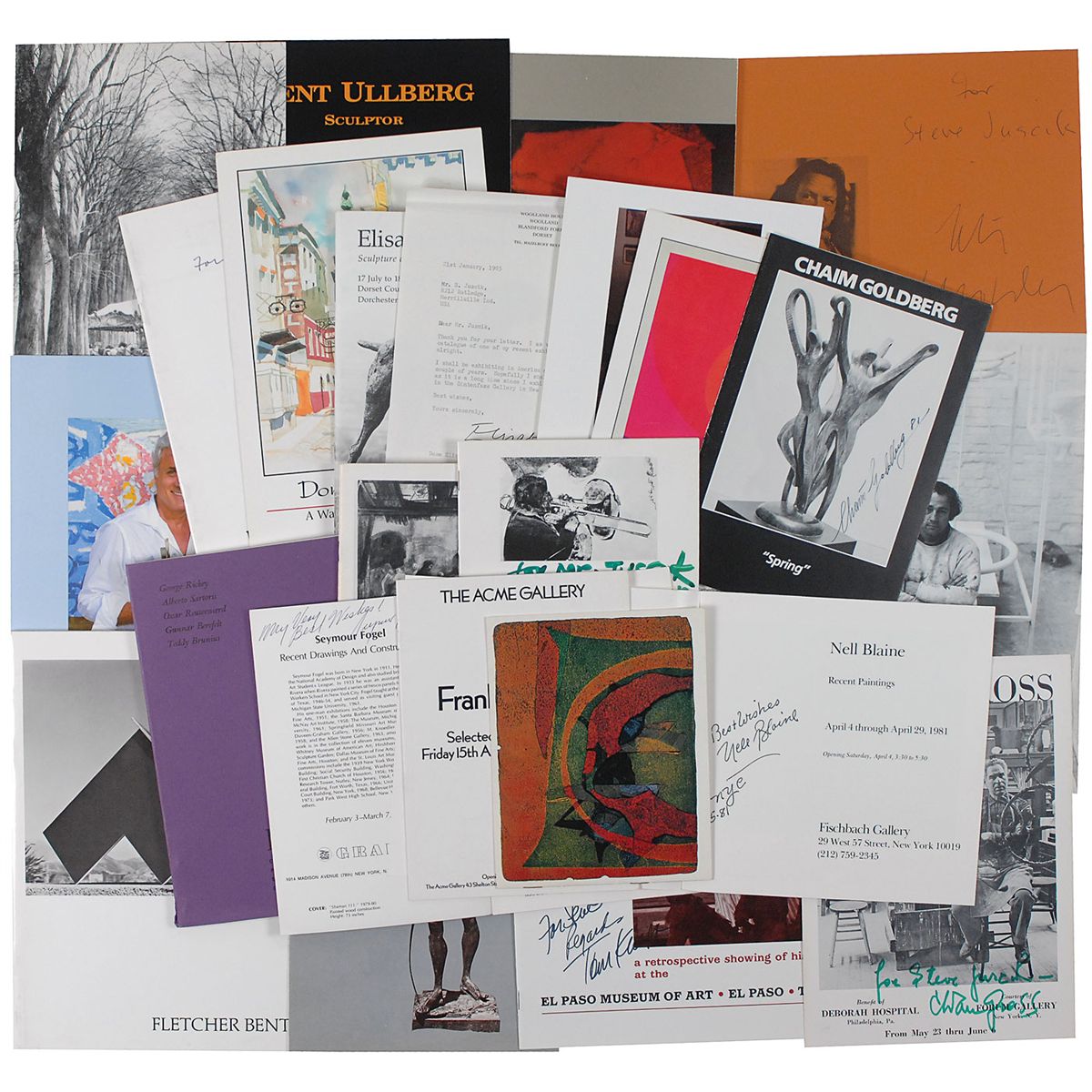Twenty-six artist’s catalogs and exhibition flyers of various sizes, each signed on the front cover or inside in ink by the associated artist, most inscribed. Signers are: Herb Aach, Robert Addison, Pietro Annigoni, Bernard Arnest, Olle Baertling, Romare Bearden, Fletcher Benton, Nell Blaine, Frank Bowling, Harold Bruder, Walter Chappell, Tony Curtis, Ken Davies, Seymour Fogel, Elisabeth Frink (with TLS), Chaim Goldberg, Chaim Gross, Nathaniel Kaz, Dong Kingman, Tom Knapp, Carl Morris, Roland Piche, Ronald, Fritz Scholder, Harold Town, and Kent Ullberg. In overall fine condition.