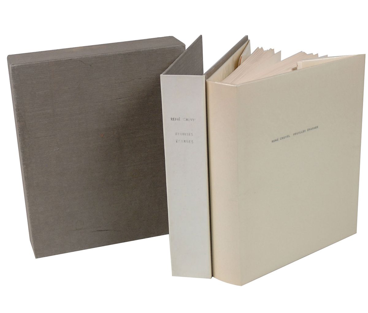 Signed unbound book: Feuilles Eparses. France, 1965. Hardcover with slipcase, 8.5 x 10, 85 pages in unbound gatherings. Signed on an opening page in pencil by Jean Arp, Hans Bellmer, Camille Bryen, Max Ernst, Alberto Giacometti, S. W. Hayter, Valentine Hugo, Wifredo Lam, Man Ray, Andre´ Masson, and Joan Miro´. In fine condition.