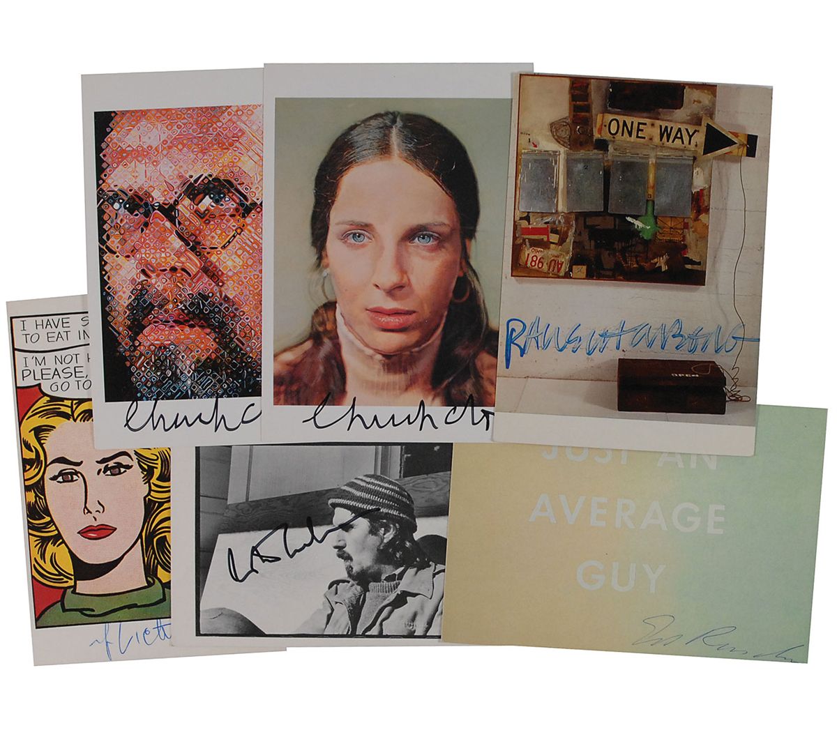 Six postcards depicting different works of art, five color, each approximately 4 x 5.75, signed in felt tip or ballpoint by the associated artist. Signers are: Roy Lichtenstein, Robert Rauschenberg, Chuck Close (2), Ed Ruscha, and Robert Creeley. In overall fine condition.