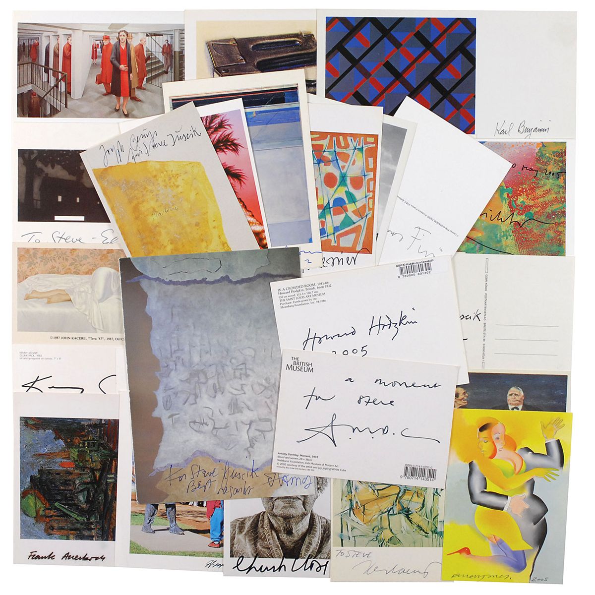 Collection of 29 postcards depicting different works of art, various sizes, each signed in ink by the associated artist, many inscribed. Signers are: Arman, Frank Auerbach, Bruce Beasley, Karl Benjamin, Joseph Beuys, Max Bill, Yves Brayer, Roger Brown, Chuck Close, Richard Diebenkorn, Don Eddy, Leonor Fini, Anthony Gormley, Richard Hamilton, Joseph Hirsch, Howard Hodgkin, C. P. Jennewein, Allen Jones, John Kacere, Alfred Manessier, Ed Paschke, Mel Ramos, Gerhard Richter, Edward Ruscha, Kenny Scharf, George Segal, Theodoros Stamos, Wayne Thiebaud, and George Tooker. In overall fine condition.