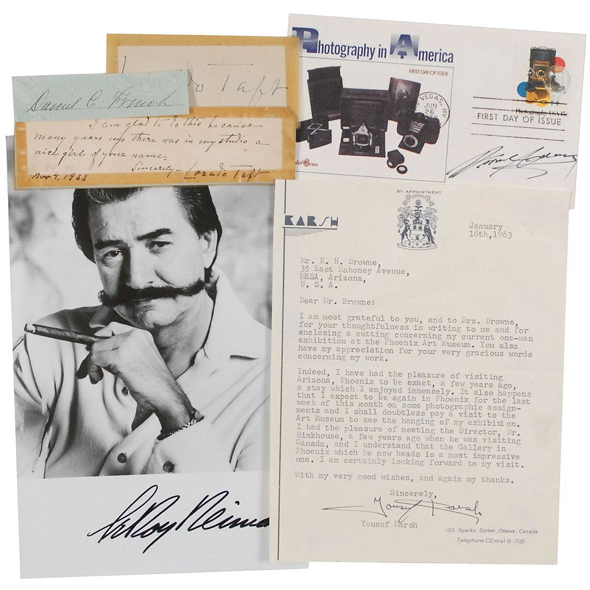 Collection of six items, consisting of signatures, letters, an FDC, and a photo, each signed by an artist. Signers are: Ansel Adams, Daniel Chester French, Yousuf Karsh, LeRoy Neiman, and Lorado Taft (2). In overall fine condition.