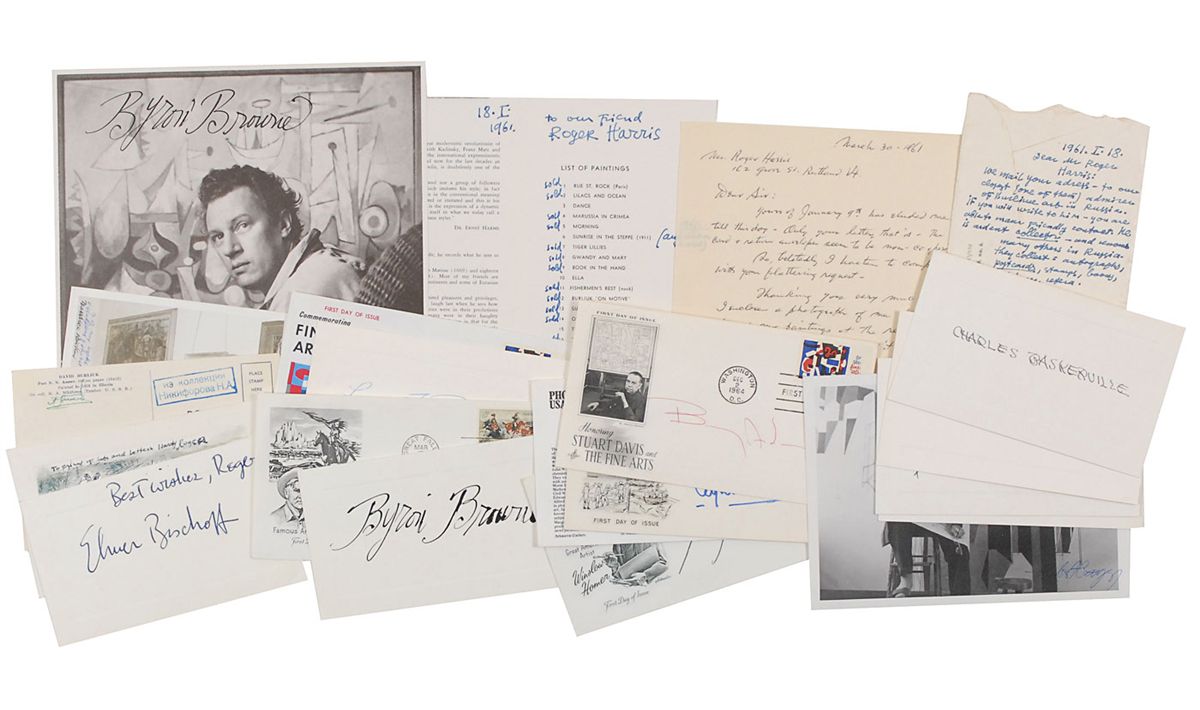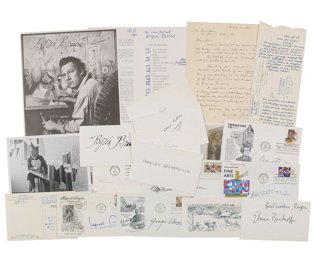 Collection of 20 items, each signed by a different artist. Signers are: Richard Avedon (FDC), Reynold Arnould (FDC), Richard Anuszkiewicz (FDC), Benny Andrews (FDC), Andreas Andersen (FDC), George Aarons (FDC), Maurice Becker (2; SP and ALS), David Burliuk (3; original sketch, unsigned notated pamphlet and unsigned envelope), Anthony Bashir (signature), Rachel Baker (signature), Charles Baskerville (signature), Loren Barton (signature), Elmer Bischoff (signature), Byron Browne (2; SP and signature), Herbert Bayer (signature), and Lorence Bjorklund (signature). In fine condition.