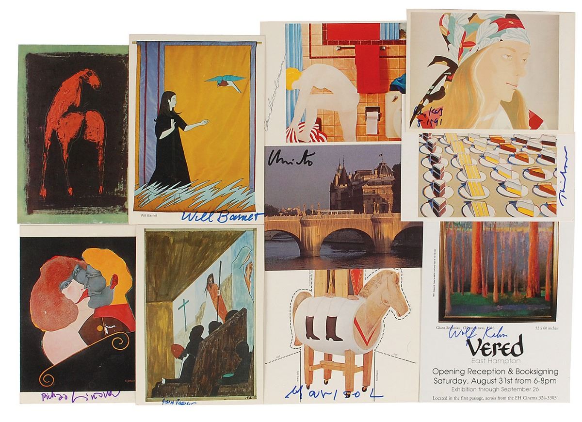 Ten postcards featuring various artworks, ranging in size from 6 x 4 to 5.25 x 7.25, each signed in various ink types by an individual artist, including: Alex Katz, Marino Marini, Jacob Lawrence, Richard Lindner, Christo, Will Barnet, Tom Wesselmann, Wayne Thiebaud, Wolf Kahn, and Marisol. In overall fine condition.