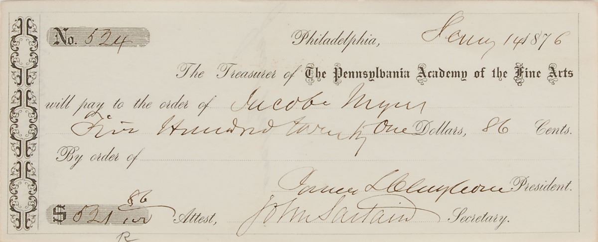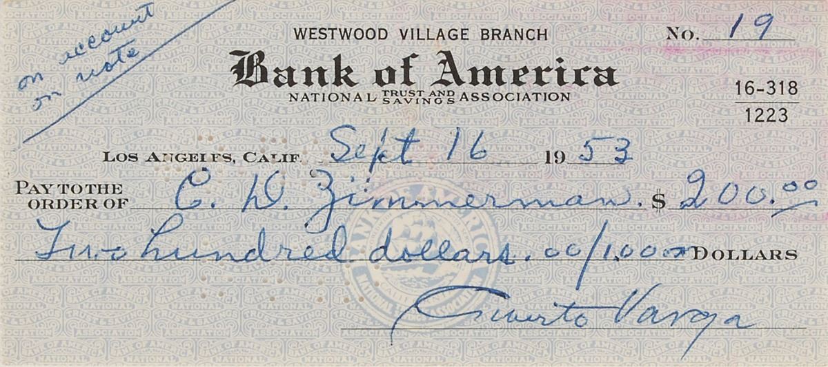 Two checks: an 1876 check signed by mezzotint engraver John Sartain; and a 1953 check signed by famous pin-up artist Alberto Vargas. In overall fine condition.