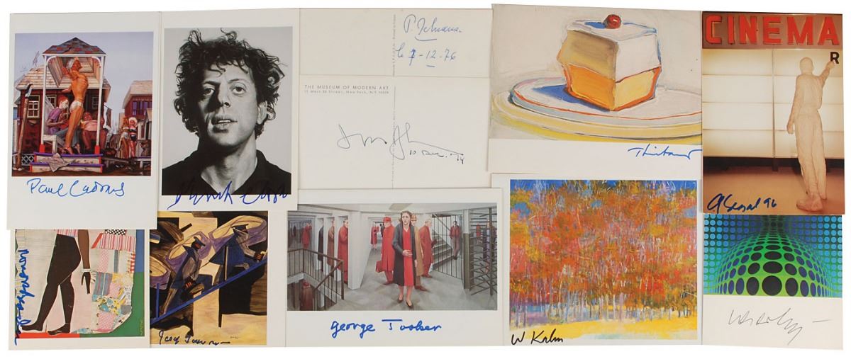 Eleven postcards featuring various artworks, 4 x 5.75 to 6.5 x 5, each signed by the associated artist, including: Jasper Johns (signed on the reverse), George Tooker, Jacob Lawrence, Chuck Close, Victor Vasarely, Paul Cadmus, George Segal, Wayne Thiebaud, Paul Delvaux (signed on the reverse), Romare Bearden, and Wolf Kahn. In fine condition.