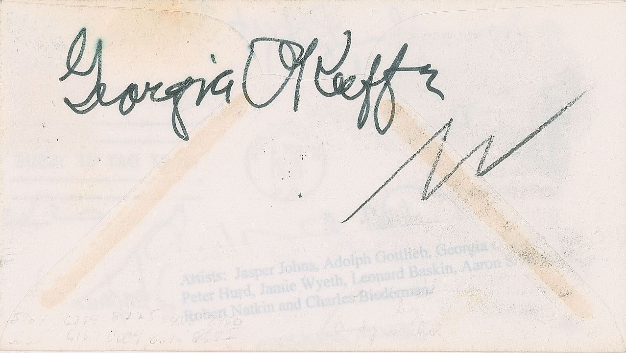 FDC with a cachet honoring the 100th anniversary of Frederic Remington, signed on the front in ink or artist pencil by Jasper Johns, Adolph Gottlieb, Peter Hurd, Jamie Wyeth, Leonard Baskin, Aaron Shikler, Robert Natkin, and Charles Biederman; the reverse is signed by Georgia O'Keeffe. In fine condition.