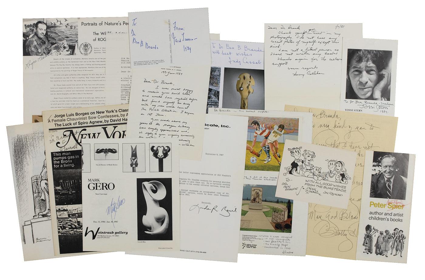 Interesting collection of over 24 items, consisting of original sketches, ALSs, TLSs, prints, documents, envelopes, and articles, each signed in ink or felt tip by a different artist. Signers include: Jacob Lawrence (2), Leonard Baskin, Walter Lantz, Milton Caniff, Tom Wesselmann, Chon Day, Dean Young, Harry Callahan, Ralph Fasanella, Scotty Holland, Anthony Cardoso, Bill Mauldin, Charles Ryskamp, Mark gero, Yossi Stern, Furman Finck, Calvin Grondahl, Donald Thrall, Frank Bunts, Erica Karawina, Judy Cassab, Roger Preuss, Peter Shelton, and Peter Spier. In fine overall condition. RRAuction COA.
