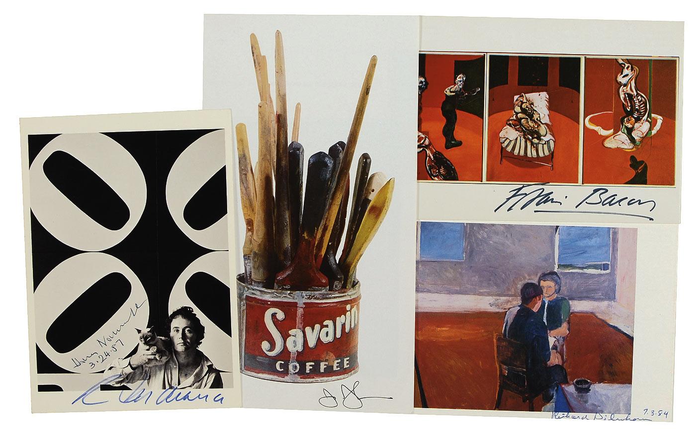 Four signed photos, three color postcards and one clipped color book photo, each signed in ink or felt tip by the respective artist featured in the photo. Signers are Jasper Johns, Francis Bacon, Richard Diebenkorn, and Robert Indiana and Hans Namuth. In fine condition. RRAuction COA.