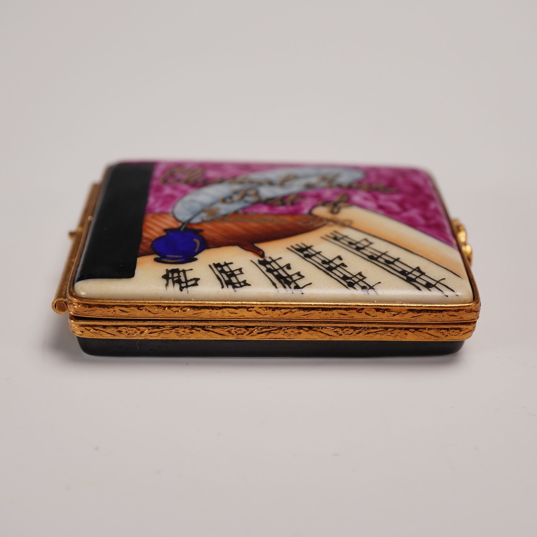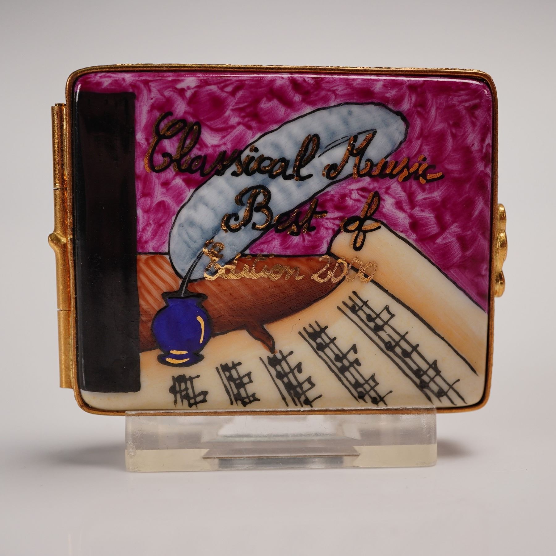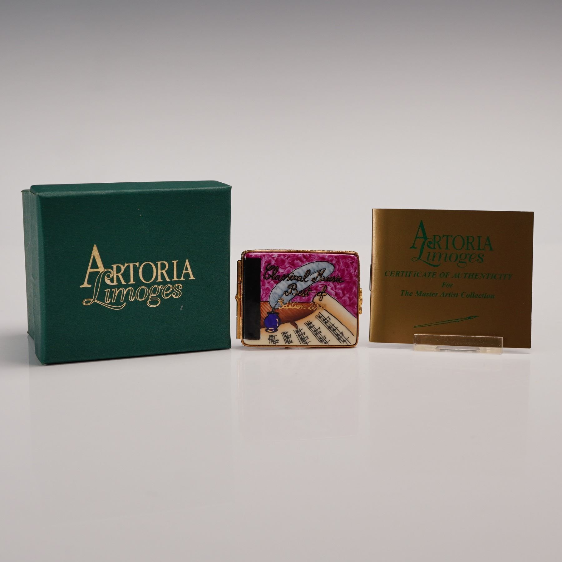 Hand-painted Artoria Limoges porcelain treasure box in the form of a book, decorated with musical notes, a quill, and the title Classical Music Best Of on the cover. Opens to reveal a removable porcelain disc painted in deep magenta with matching inscription. Gilt metal mounts with double heart clasp. Marked Artoria Limoges, Peint Main, Made in France, and numbered 24/1000 to the base. Includes original Artoria Limoges presentation box and certificate of authenticity. Measures 2.25"L. Box measures 3.25"L x 2.5"H.