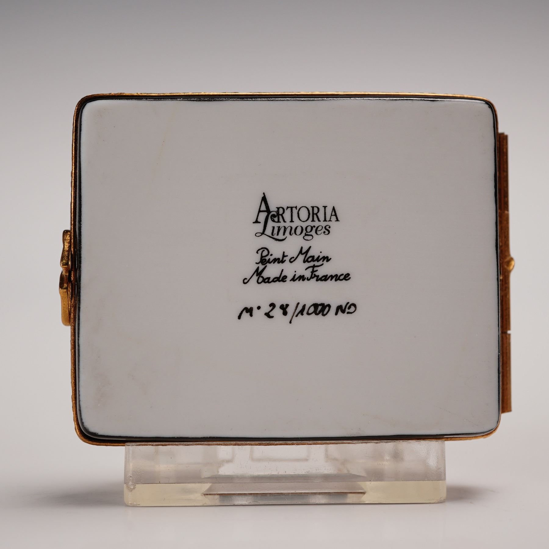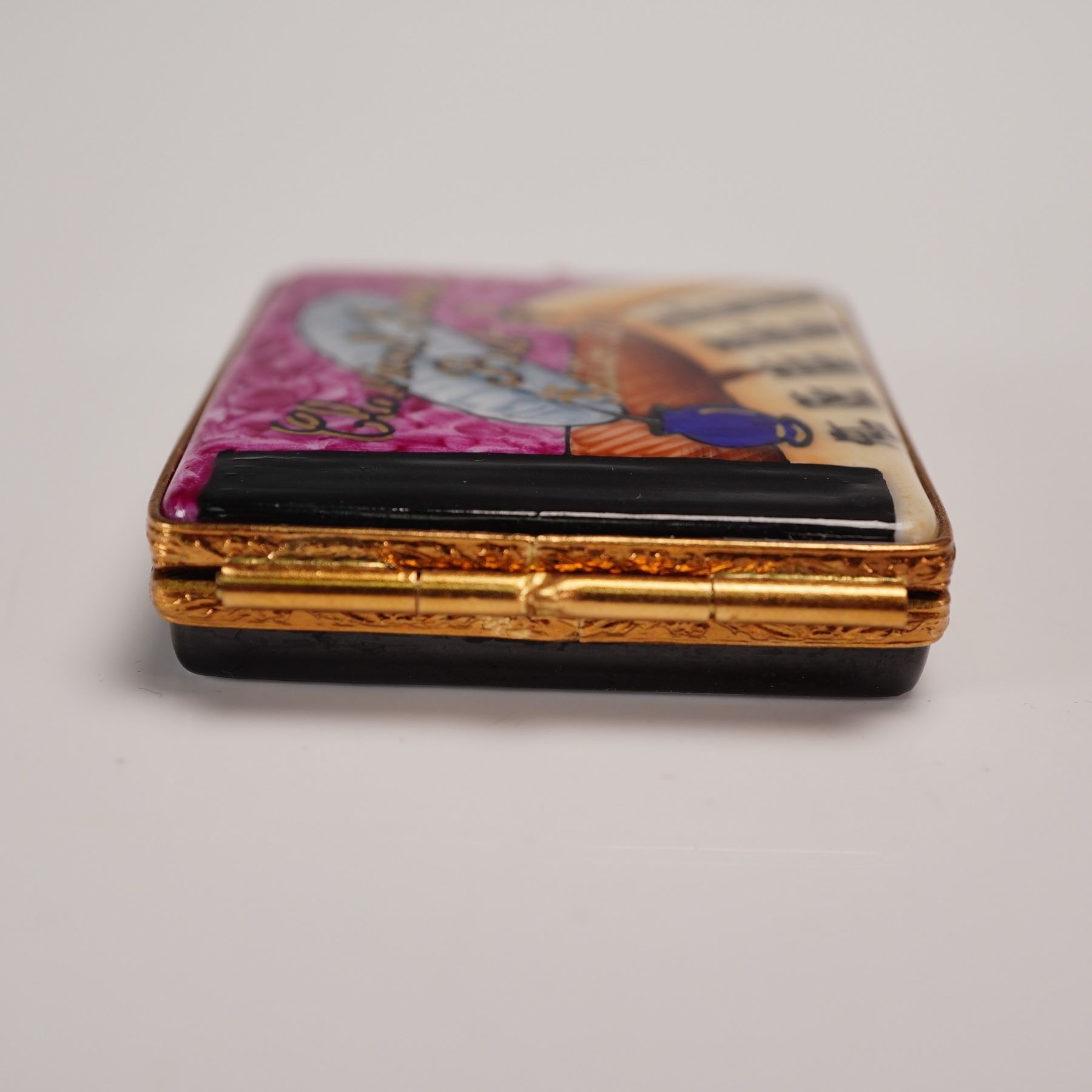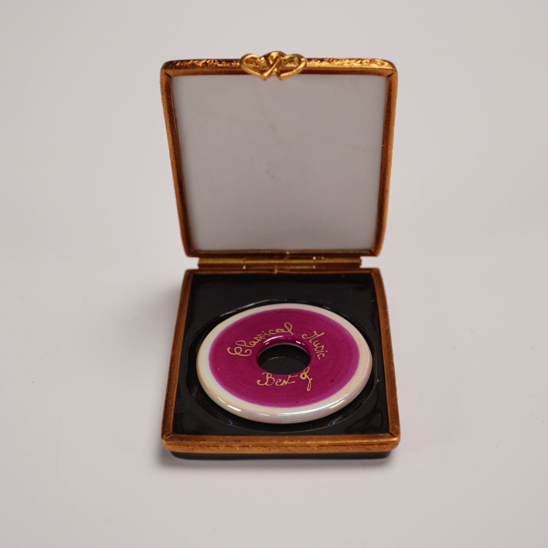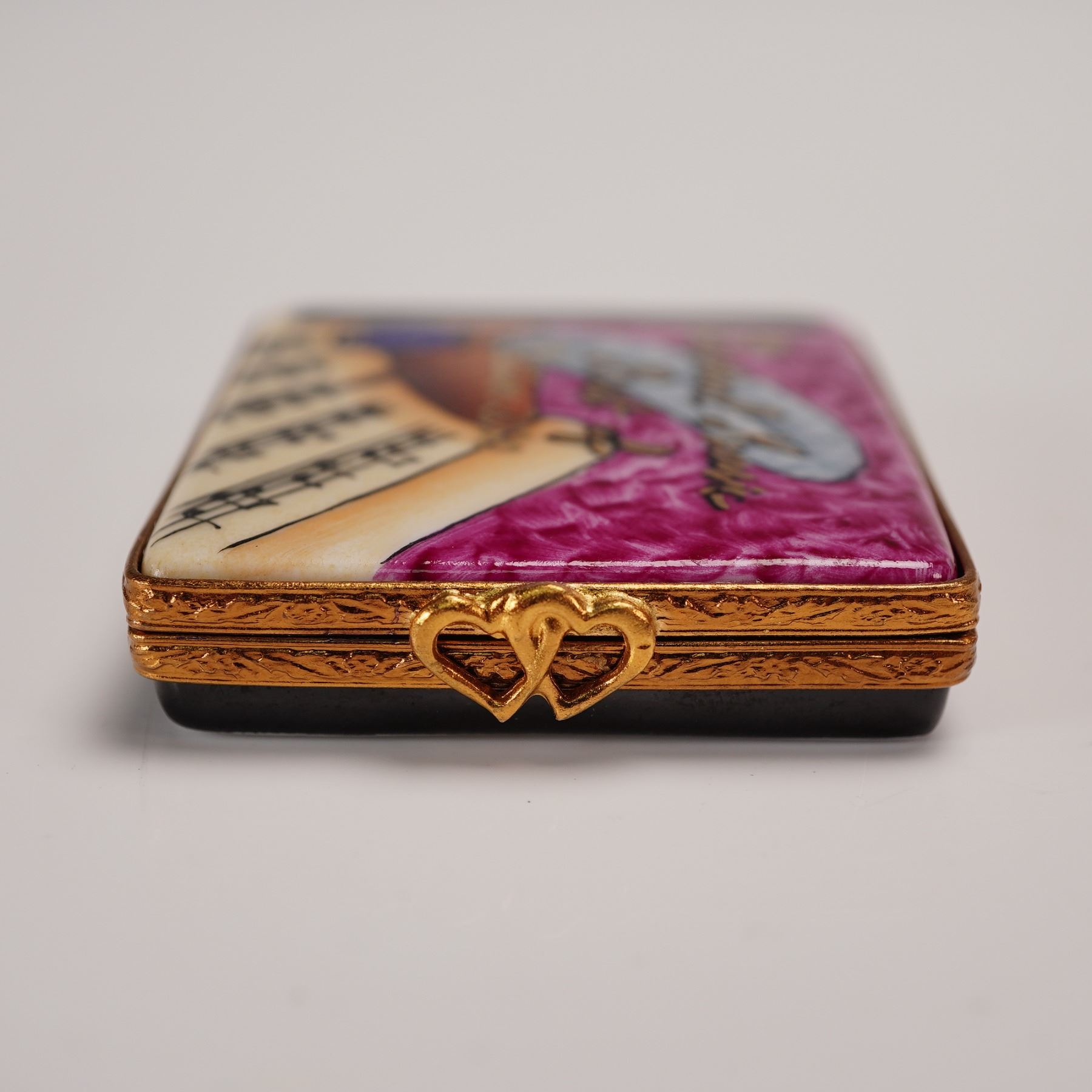 Hand-painted Artoria Limoges porcelain treasure box in the form of a book, decorated with musical notes, a quill, and the title Classical Music Best Of on the cover. Opens to reveal a removable porcelain disc painted in deep magenta with matching inscription. Gilt metal mounts with double heart clasp. Marked Artoria Limoges, Peint Main, Made in France, and numbered 24/1000 to the base. Includes original Artoria Limoges presentation box and certificate of authenticity. Measures 2.25"L. Box measures 3.25"L x 2.5"H.