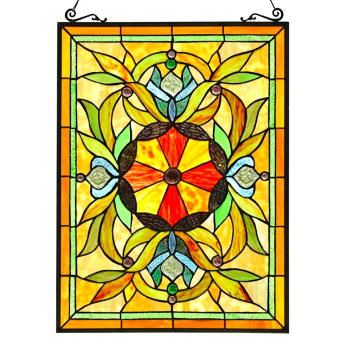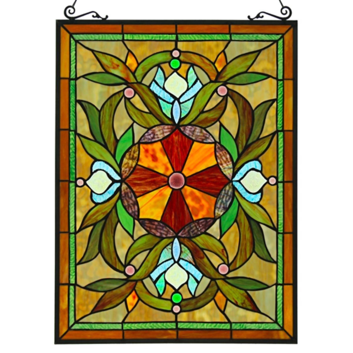 Arts & Crafts style floral design stained art glass hanging window panel, created using 150 pieces of stained art glass & 17 glass beads & crystals. 18" X 25".