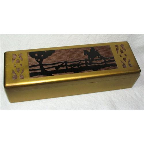 Antique Arts and Crafts wood box, with bas-relief carved hunt scene silhouette and ornamental side carvings. This unusual, hinged box has rounded edges and dove-tailed corners and is painted gold. The bas-relief silhouette is painted black, and the carved-out portions follow the wood grain and are the natural color of the wood, which is most likely mahogany. The box measures about 3 inches high, 12 5/8 inches wide, and 4 inches deep. The box is in very good condition, with a well-fitting lid, solid hinges, and light surface wear. There are a few small dents and scratches, and a sliver of wood missing from the front outer edge where the lid and bottom meet. Please refer to the 4 photographs for appearance and condition. Shipping / packaging will be $10.00.