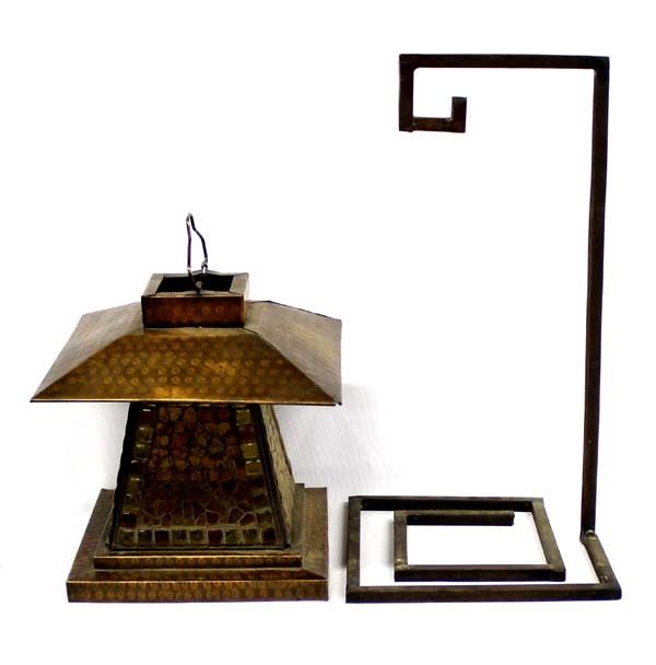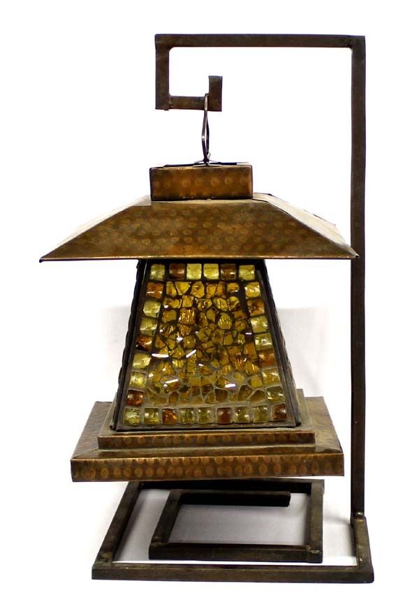 Arts & Crafts Copper and Stained Glass Lantern on Stand, measures 10'' x 15'', beautiful iridescent gold and light orange stained glass mosaic, hammered copper top and base