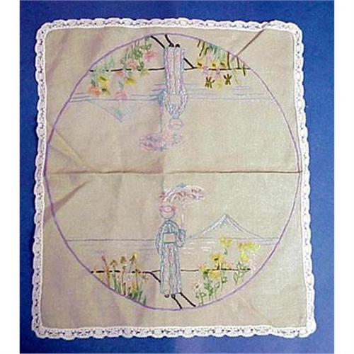 Pretty and very unique embroidered square piece depicting very,very pretty Geisha Girl amongst the colorful flowers - Arts & Crafts style - Very good condition - Free of damage - Measures about: 16" x 16" - Please include 2.00 for shipping Thanks!