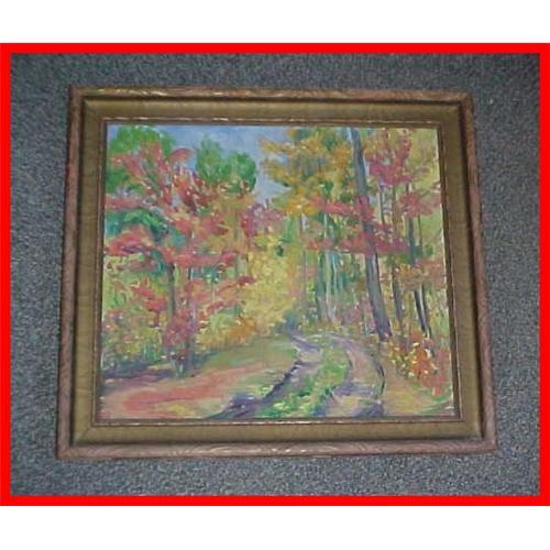 This 19-3/4" by 21-3/4" framed oil painting on stretched canvas has a partial signature of "Harriet ?". This Arts & Crafts style original oil painting has heavy brushstrokes and vivid coloring. The size of the actual painting is 16-1/4" by 18". Probably American origin. Good condition with some scuffing on frame; painting in very good condition with no holes or rips. I have owned this original painting for several years and bought from a Midwest antique shop.