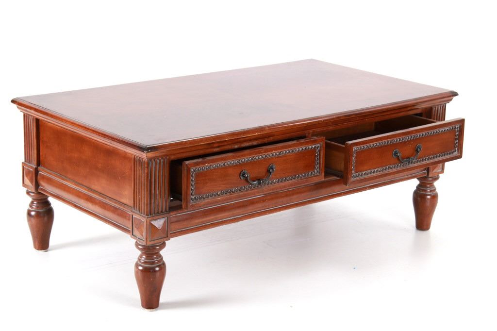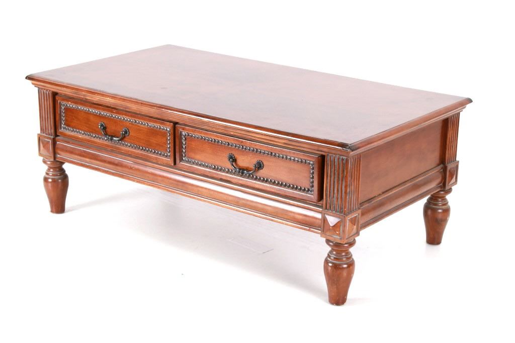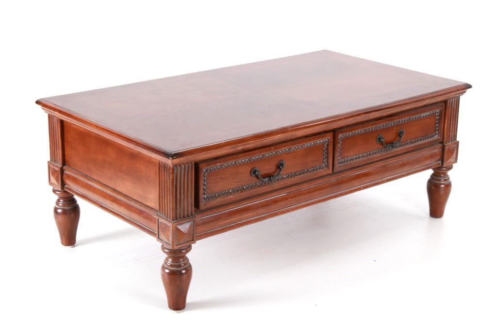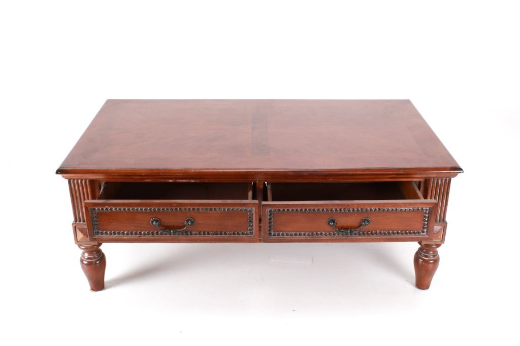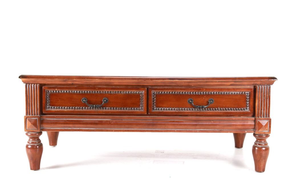 Featured in this lot is this Arts & Crafts Mission Style oak coffee table. The coffee table features a wonderfully and professionally crafted oak construction that shows two drawers that are felt lined with brass handles and the legs are all lathe turned with a beautiful symmetrical design. The condition of this mission style coffee table is good with no obvious signs of damage and shows good overall condition. The measurements of this mission style coffee table is 19" x 49 1/4" x 27 3/4". The collective weight of this coffee table is 61 pounds.