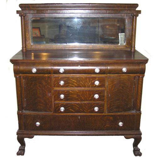 This antique tiger oak sideboard in late victorian and arts and crafts style dates from the late 19th century. Measures 48" wide, 21" deep and 56" high. Top surface measures 37.5". All original hardware, including key. Features a unique barrel shaped top row of drawers, classical turned pilasters on each front corner, and cabriole legs ending in claw feet. This item resides on the upper west side of Manhattan ( New York city ) and may be seen by appointment.