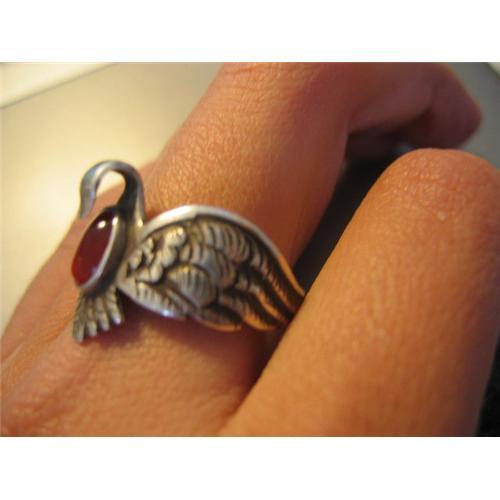 89MLUX2007. We found this splendid sterling silver ring in an estate lot. It appears to be hand carved and in the design of a bird. Circa early 1900s. Arts & Crafts style. It has a hallmark inside that appears to be 925. Very hard to read. It is guaranteed to be old and solid sterling. It has a red stone in the front. Magnificent carving. Size 9.5. It weighs approx. 5.3 grams and is in excellent condition. Ships from the USA to the USA for $8.95 insured. Ships to Europe, Canada, Australia or Japan for $24.95. Paypal users must have a confirmed address.