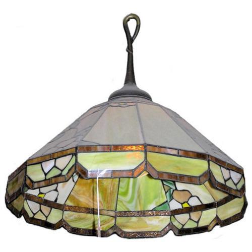 This fantastic vintage hanging lamp of stained glass measures approximately 26" across and 22" high. Electrified and in fine working order. It features panels of multi-colored green, and yellow and white glass. Maker is unknown. Believed to date from the early 20th century. This item resides on the upper west side of Manhattan ( New York city ) and may be seen by appointment.