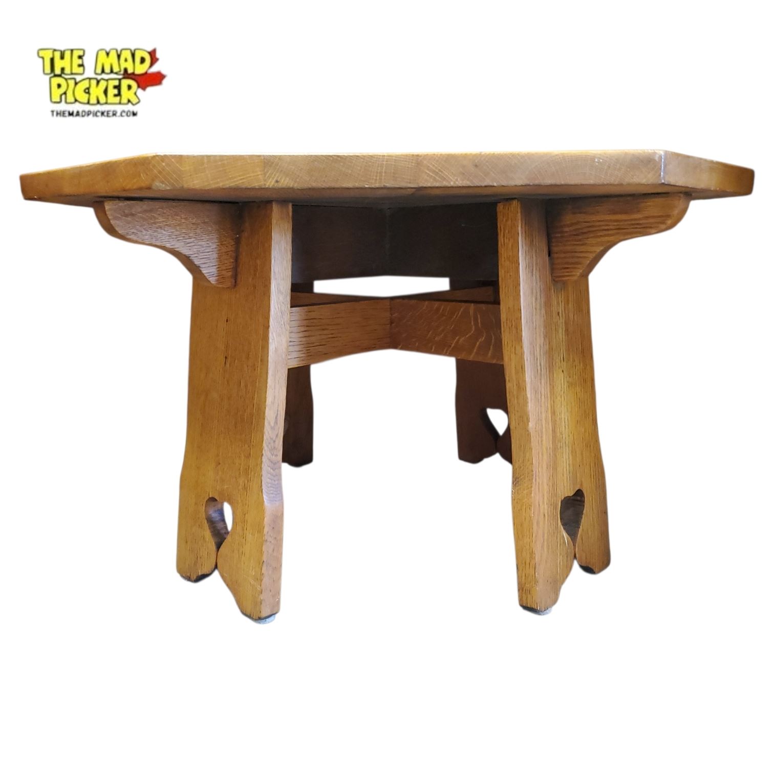 Oak octagonal occasional table in the Arts & Crafts style, attributed to Heals or Liberty & Co. Crafted circa early 20th century. Features a simple yet elegant design with clean lines. Dimensions are 24in x 24in x 15in tall, showcasing the period's emphasis on craftsmanship and function.