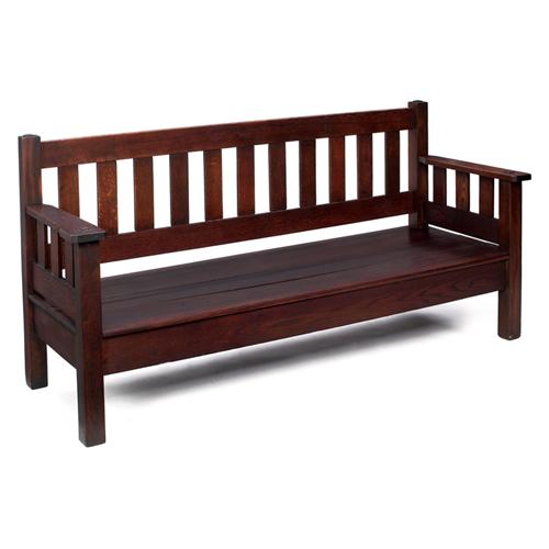 Arts & Crafts bench, drop arm form with 11 vertical slats at back and five under each arm, solid seat, one replaced arm, refinished, 74"w x 27"d x 37"h, good condition