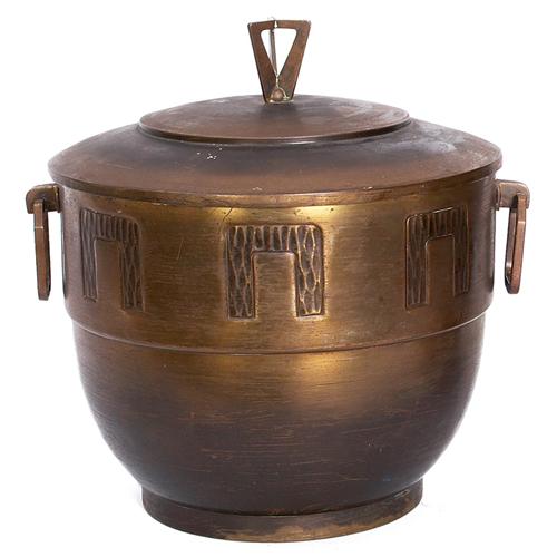 Arts & Crafts covered vessel, large form in brass, two handles and incised decoration, original patina, signed Gesgesch, 15"w x 15"h, very good condition