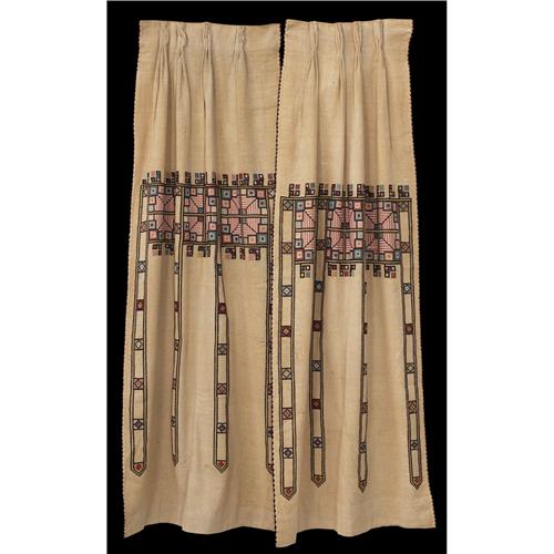 Nice Arts & Crafts curtain panels, pair, geometric design in dark blue, light blue, pink, black and gold on oatmeal linen, 29"w x 61"