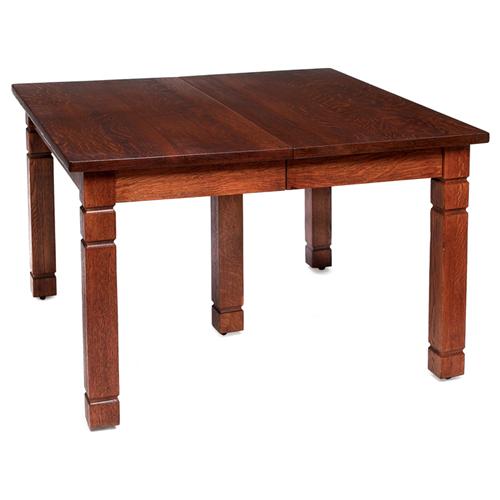 Arts & Crafts dining table, square top over five legs with a notched design, four original leaves, refinished, 48"w x 48"d x 30"h, very good condition
