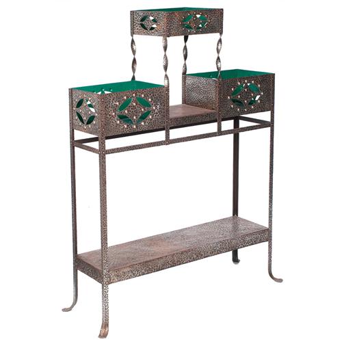 Arts & Crafts fern stand, probably Austrian, hammered iron with three planters having a reticulated design over a lower shelf, original patina, 36"w x 11"d x 49"h, excellent condition