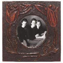 Arts & Crafts frame, wood with deeply carved tulip decoration, original finish, 6.5”sq., some minor chips, nice