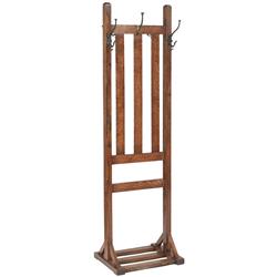 Arts & Crafts hall tree, double posts with three vertical slats, brass hardware, refinished, 20”w x 18”d x 73”h, very good condition