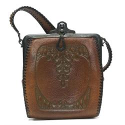 Arts & Crafts handbag, leather with tooled floral design, original finish, 5” x 6.5”; with a Arts & Crafts handbag, (not shown), leather with tooled floral design, original finish, 5.5” x 6.5”