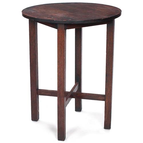Arts & Crafts lamp table, manufactured by B-J Company, circular top over cross stretcher base, original finish, signed, 24"dia. x 30"h, very good condition