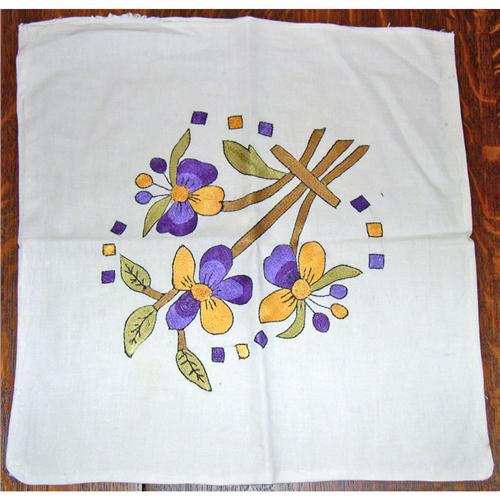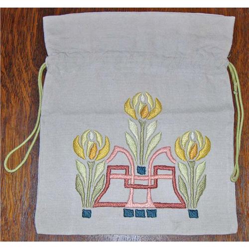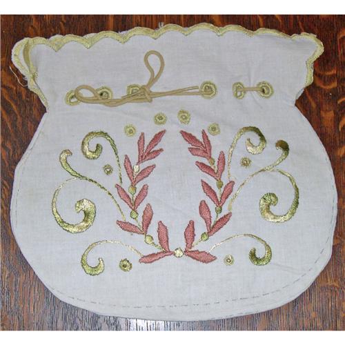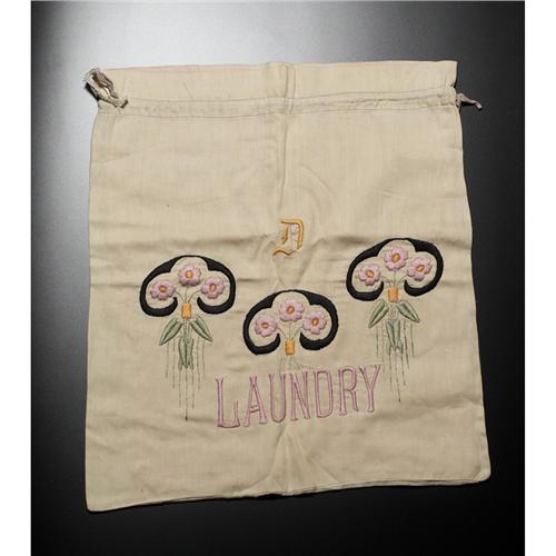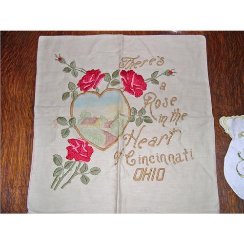 Arts & Crafts laundry bag, 20" x 22", minor discoloration; with an Arts & Crafts pillowcase, (not shown), "There's a Rose in the Heart of Cincinnati Ohio", 19" x 20"; with an Arts & Crafts purse, (not shown), wreath, 10.5"w, minor stains; with an Arts & C