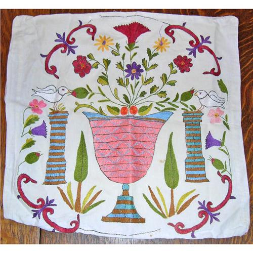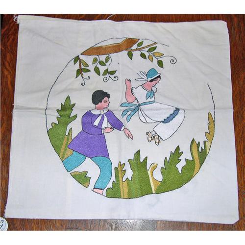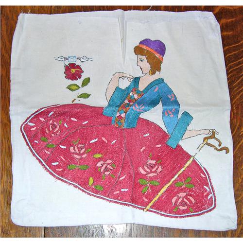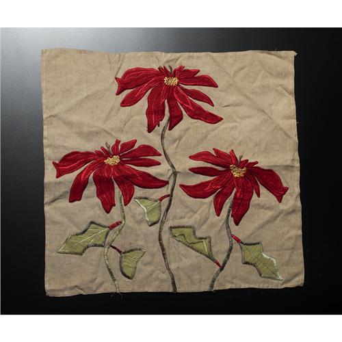 Arts & Crafts linen, Poinsettia, 23" x 21"; with Arts & Crafts pillowcases, (not shown), four, various colorful patterns, all 16"sq., some embroidery is missing, all with minor stains