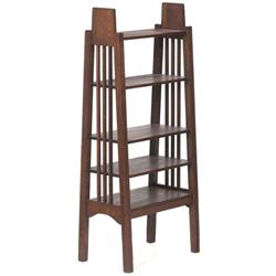 Arts & Crafts magazine stand, four shelves with three vertical spindles on each side, recoated original finish, 19”w x 13”d x 46”h, very good condition