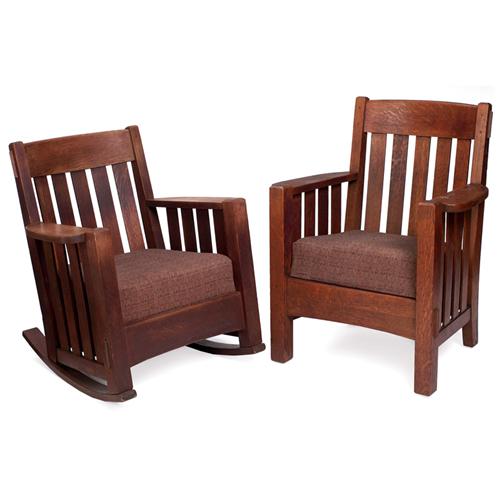 Arts & Crafts rocker and armchair, manufactured by Cortland, five vertical slats at back and four under each arm, thru-tenon construction, original spring cushions, original finish, signed with paper label, rocker: 31"w x 32"d x 35"h, armchair: 37"w x 25"