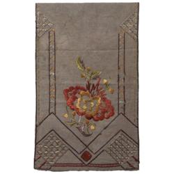 Arts & Crafts runner and tablecloth, (runner shown), brown linen with colorful floral design, runner 58”l, tablecloth 78”l, one runner 50”l, minor wear to both