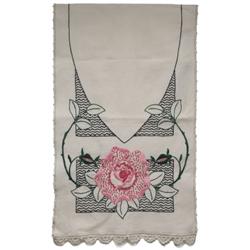Good Arts & Crafts runner, ivory linen with finely embroidered design of a pink rose, lace trim to edges, 51”l, minor wear, nice colors