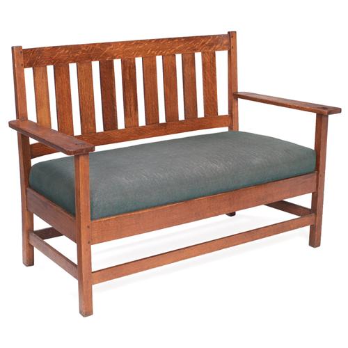 Arts & Crafts settle, drop arm form with nine slats at back, recovered original spring cushion, light recoat over original finish, some repairs, 56"w x 28"d x 38"h, good condition