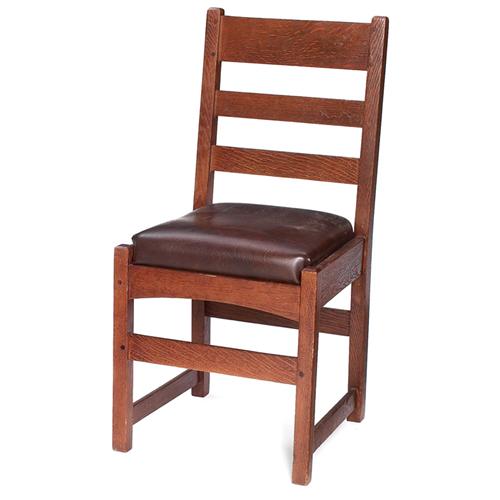 Arts & Crafts side chair, ladderback form with three horizontal slats to back, drop-in cushion over an arched seat rail, refinished, some repairs, 17"w x 17"d x 34"h, good condition