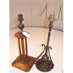Arts & Crafts style brass table lamp having a central pillar with globular base and triple stylis...