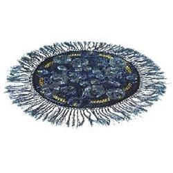 Unusually nice Arts & Crafts table mat, black linen with elaborate embroidered peacock feather and floral designs in blues and yellow, fringed edge, 35”dia