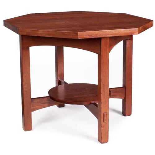 Arts & Crafts table, octagonal top over an arched apron and lower circular shelf supported by arched thru-tenon stretchers, refinished, sanding marks to legs, 39"w x 39"d x 30"h, very good condition