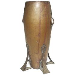 Decorative Arts & Crafts umbrella stand, large tapering shape in hammered copper, four applied feet and two applied ring handles, original patina, 25.5”h, the craftsmanship is similar to Stickley Brothers, it is possibly from Grand Rapids, Michigan, beautifully executed