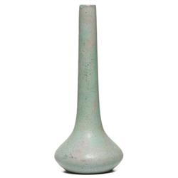 Arts & Crafts vase, tall and tapering bottle form covered in a mottled green matt glaze, 10.25"h