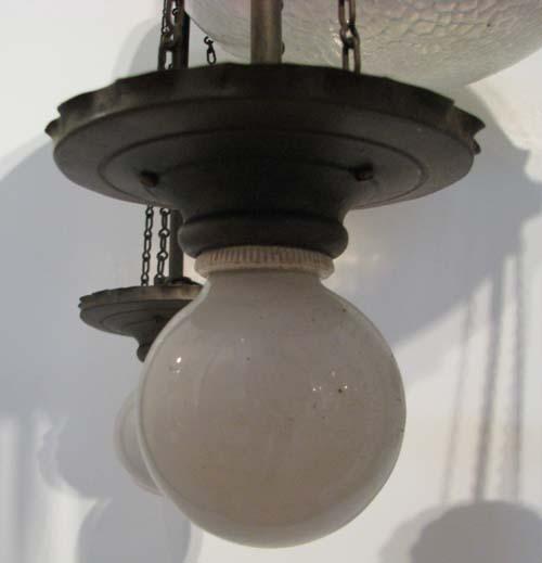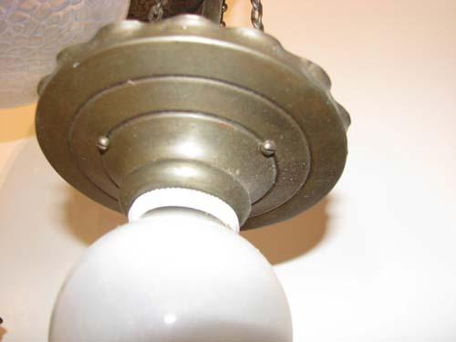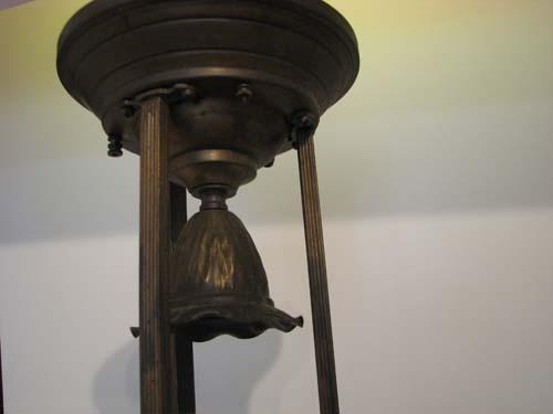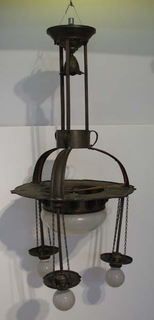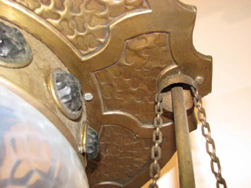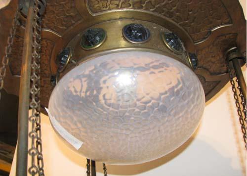 Title: Arts and Crafts Brass Chandelier with Colored Glass Inserts